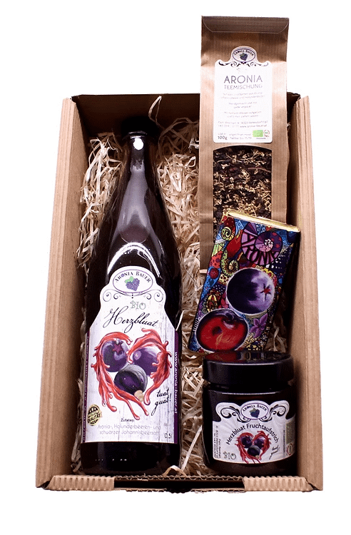 Aronia Herzbluat Fruchtaufstrich 180g Aronia Herzbluat 0,5l Aronia Scholkolade 70g Aroniateemischung 120g