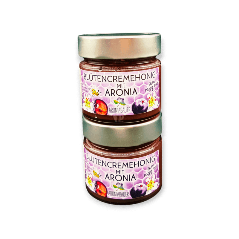 Zutaten: Blütenhonig, ganze Aroniabeeren getrockent und gemahlen.